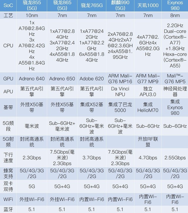 目前在售的5G芯片中,这六款芯片比较受用户信赖:麒麟990(整合基带)、骁龙855(外挂基带)、骁龙765(整合)、骁龙865(外挂基带)、天玑1000(整合)、Exynos 980处理器(整合)。尽管都属于5G芯片的范畴,但是有些芯片还处于4G~5G的过渡阶段,尚不能跑出5G的真实网速,这是为什么?