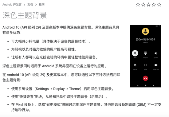 相比起苹果那种从人性化角度出发的抒情说法,Google 的说法显然要务实许多,它们在 Android 开发者网站的黑暗主题开发指导中写道深色主题具备的三大优势: