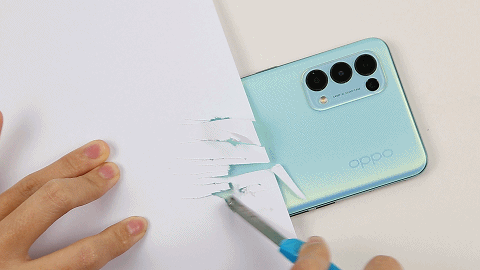 从下面的动图以及图片我们可以清楚地看到,测试过程中用上了钥匙、刀片、剪刀,轮番上阵对着OPPO Reno5系列新品一顿折腾,这些都是平日生活里常见的尖锐物品,极易对手机外壳造成刮痕、损坏等。