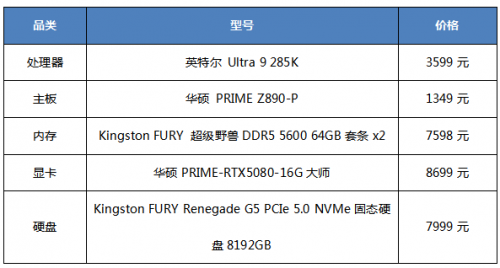 英特尔 酷睿UltraUltra 9 285K处理器是目前旗舰级处理器的代表,拥有8大核16小核24线程,大核频率3.7-5.7GHz,小核频率3.2-4.6GHz,二级缓存40MB,三级缓存36MB。主板选择了华硕 PRIME Z890-P,这款主板采用14+1+2+1供电模组,四条内存插槽支持最大192GB DDR5内存,4组M.2插槽,其中1组还支持PCIe 5.0x4模式,在规格上提供了无限可能!