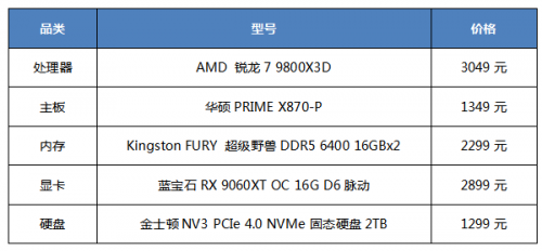 更多预算当然会有更出色的性能表现,想在2K高画质下流畅运行绝大多数的3A大作,这套配置一定错不了,AMD的X3D系列处理器叠加RX9060XT显卡,经济型的性能组合,游戏百帧起步。