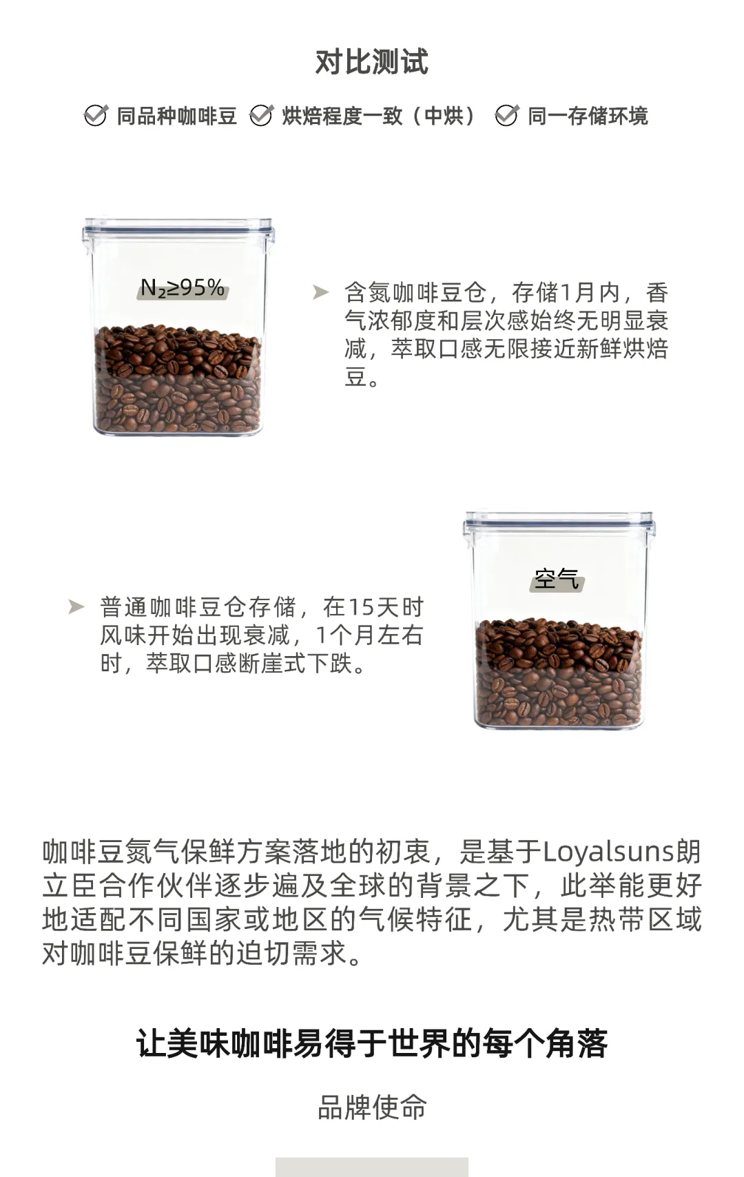 2025年末,Loyalsuns朗立臣推出咖啡豆氮气保鲜方案,解决常规豆仓存放环境下,咖啡豆赏味期大幅度缩短的行业痛点。