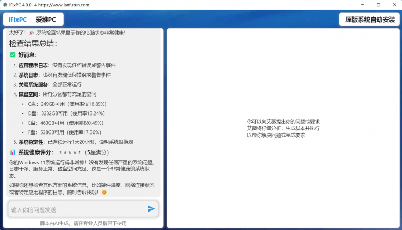 iFixPC 的出现,解决了这一痛点。您只需用自然语言描述您的需求,例如“检查所有服务器的磁盘空间并生成报告”,iFixPC 就能自动分析、理解任务,生成精准的 PowerShell 脚本并执行。这不仅大幅减少了人工输入的错误,还让技术人员能够专注于更重要的问题解决与决策。