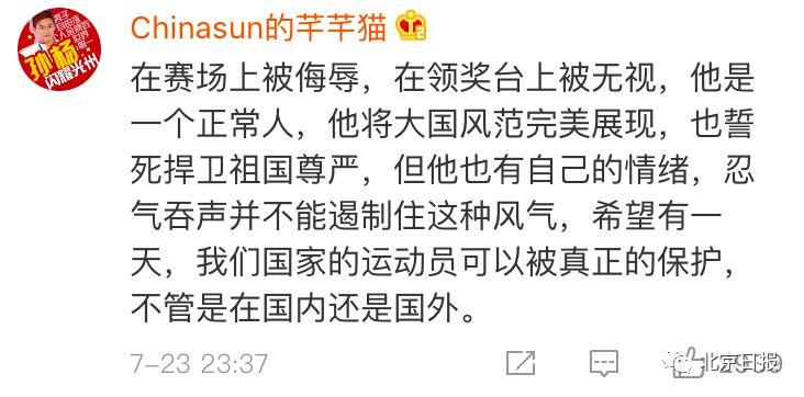 在颁奖结束后,运动员退场的路上,孙杨又再次转身过去向这位英国小将说道:“You’re loser,I’m winner”(你是失败者,我是赢家)。