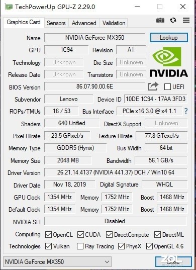 从GPU-Z检索来看,MX350拥有640个流处理器、2GB GDDR5显存,64bit显存带宽,核心频率1354MHz,显存频率1752MHz,Boost频率可达1468MHz。
