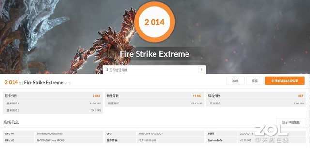 3DMark Fire Strike Extreme以及Fire Strike测试模式下。前者图形分数为2043,后者图形分数为4461。对比满血版MX250独显的话,FSE模式性能提升大概为500分左右,幅度约为22.3%左右;FS模式性能提升大概为1000分左右,幅度大概为21.6%左右。